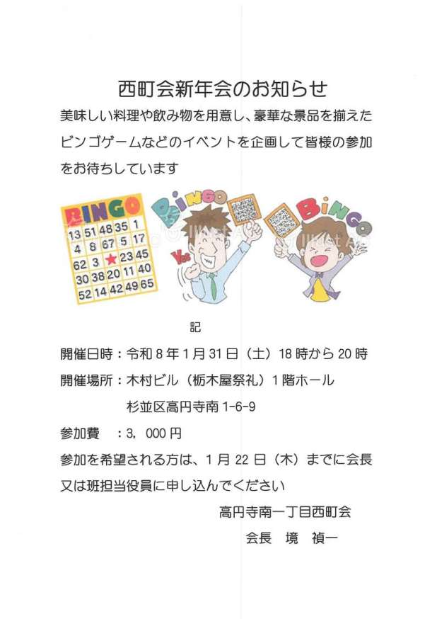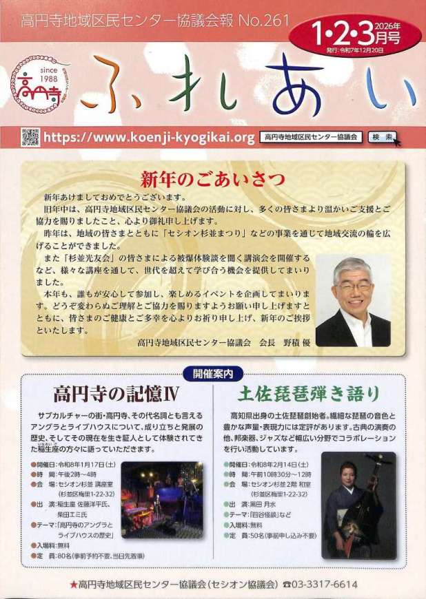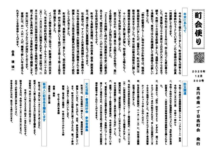 「町会便り303号」・高円寺ひがし児童館「2026年1月号」・安全パトロール隊ニュース「R7.12月号」・「座・高円寺寄席冬」・「セシオン=であい寄席」を掲載しました。 |