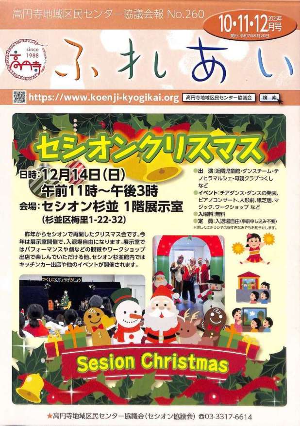 町会便り300号・高円寺ひがし児童館10月号・杉三小「学校運営協議会だより」(回覧板のページ)・高円寺みんなの体育館「スポーツフェスティバル」・「けやきNo.90」(けやきのページ)・セシオン杉並協議会「ふれあい260号」・町会便り「299号」(町会便りのページ)を掲載しました。 |
